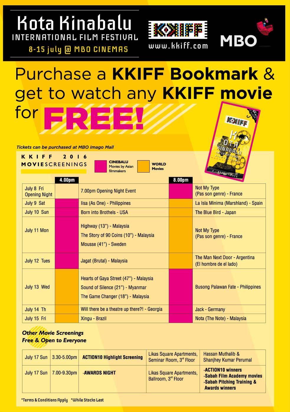 Come & watch local & internationally acclaimed movies! Just purchase a KKIFF bookmark at MBO IMAGO to watch any KKIFF movie for FREE!